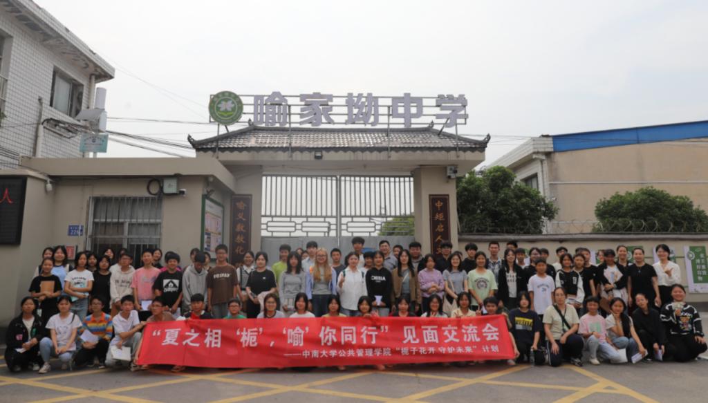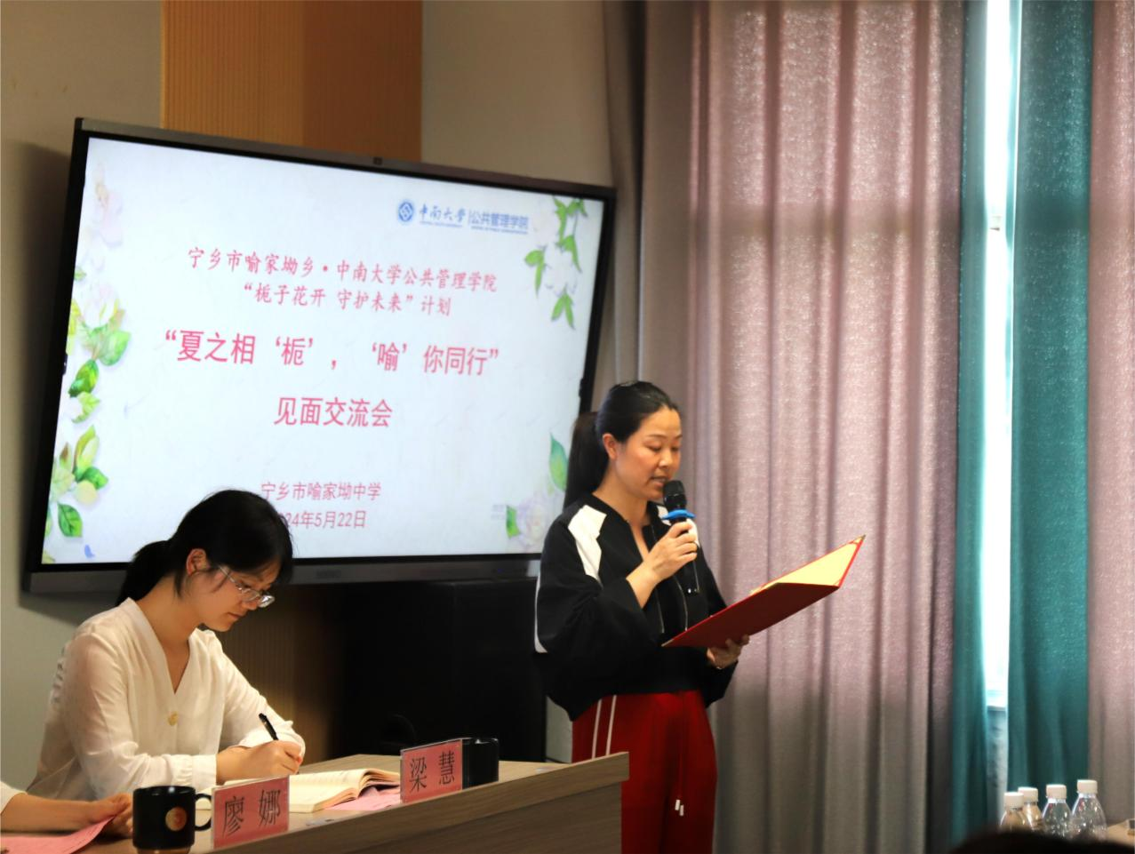 为推进大中小学思想政治教育一体化建设,探索适合乡村未成年人成长的方法,助力教育强国建设,2024年5月22日下午,在宁乡市喻家坳乡政府的大力支持下,william威廉英国官网公共管理学院组织大学生志愿者,赴宁乡市喻家坳乡喻家坳中学,举办“夏之相‘栀’,‘喻’你同行”未成年人思想道德教育活动。该活动是喻家坳乡党委与公管院联合开展“栀子花开 守护未来”计划的第三次线下活动,旨在增进大学生志愿者与结对帮扶中学生的交流,强化未成年人思想道德教育。公管院党委副书记耿贵斌,喻家坳乡副乡长廖娜,喻家坳中学党支部书记、校长罗湘伶,喻家坳中学办公室主任王亚平,公管院辅导员梁慧,喻家坳中学生和公管院大学生志愿者参加。