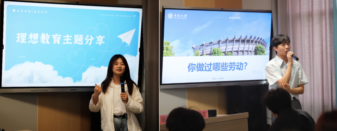 紧接着,公管院大学生志愿者代表黄蕾、高彬分别做主题分享。黄蕾同学分享了理想信念教育,引导中学生们结合自身情况,树立远大的个人目标。高彬同学将劳动精神与身边的劳动、志愿服务经历相结合,在深入浅出的讲解和幽默风趣的互动中,让中学生们感受到劳动的重要性和志愿服务的意义。