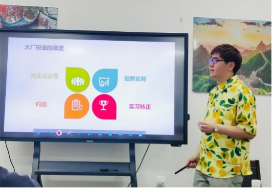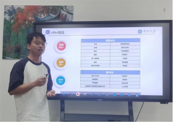 分享会上,三位同学还分享了求职信息收集的途径,包括常用的求职软件、公众号、群聊以及内推等,帮助同学们更高效地搜集求职信息。同时,他们还分享了面试经验,包括自我介绍、宝洁八大问、常见问题回答技巧以及反问环节的策略。此外,三位同学都强调了面试失利的经验教训,提醒同学们在求职过程中要保持积极的心态,不断尝试和总结经验。