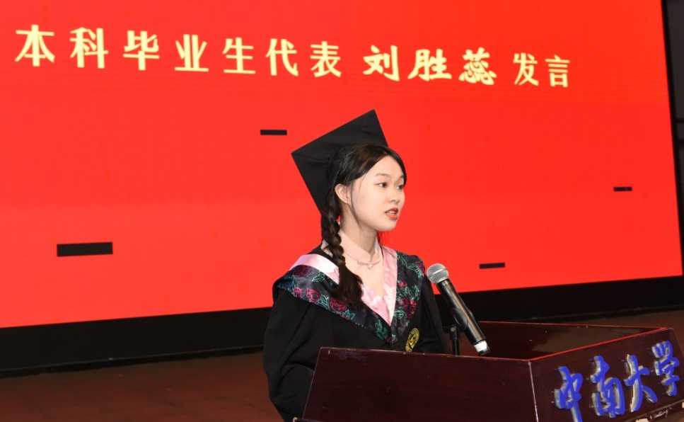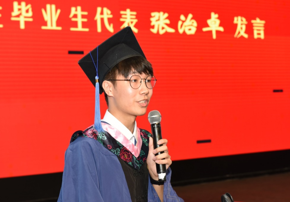 随后,本科生毕业生代表刘胜蕊、研究生毕业生代表张治卓发言。从回首求学路,到展望未来时,他们以激情昂扬的发言表达了对学科专业的深刻理解和自己求学之路的深刻感悟,表达了对学院与老师的感激之情,更是表达了对未来的期待。