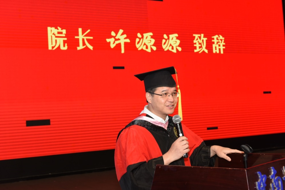 接着,公共管理学院院长许源源致辞。他从社会的风险讲起,强调风险是一种有概率的不确定性,而不确定性当中既有危机,更蕴含着无限的生机。他希望广大的毕业生们,当对这个时代有100个悲观的理由时,还要持有101个乐观的期待,要乐观地面对人生中的各类挑战,勇敢地自由地追求自我价值的实现,即使再难也不放弃,更希望同学们在未来能够仗剑执法,秉持公共价值,牢记人之为人的独有意义。