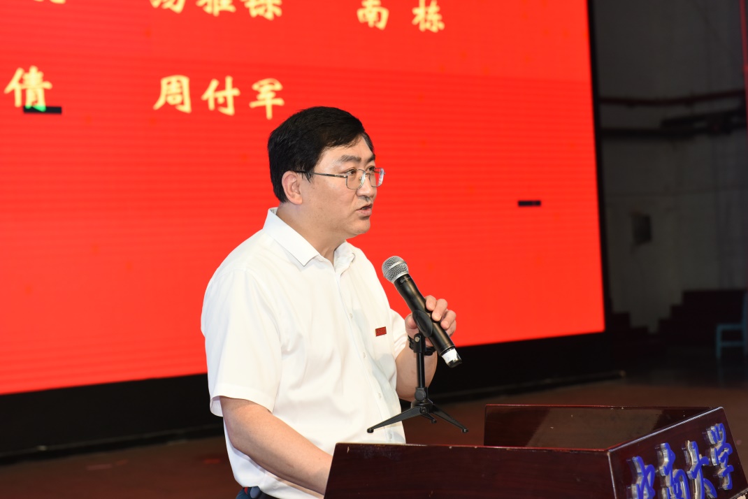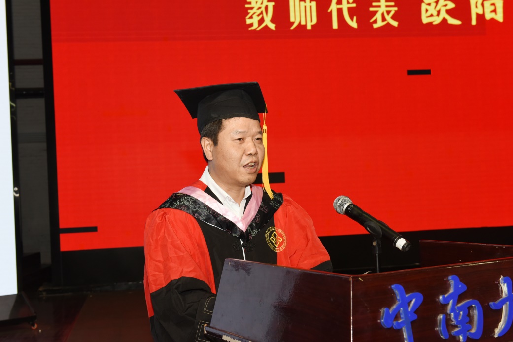2024届优秀毕业生名单宣读完毕后,教师代表公共管理系欧阳万福老师发言。他希望同学们在未来面临更多的机遇和挑战时谨记:外面的社会不会像大学校园一样的开放和包容,希望大家能够保持初心,坚定信念,不断追求卓越,实现自己的人生价值。