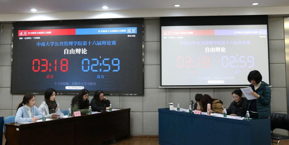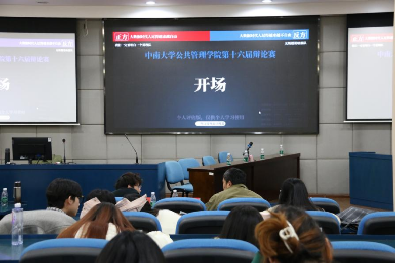 12月11日晚7时,公共管理学院第十六届辩论赛决赛在铁道校区公共管理学院院楼404报告厅准时开始。经过半决赛的激烈角逐,由经管类2410班同学组成的“啊对对队”、行管2302班、2301班同学组成的“我们一定要明白一个道理队”和由硕士班同学组成的“无所谓说啥都队”脱颖而出进入决赛。公管院学工办主任徐立坤老师、校辩论队教练张汶铮和校辩论队副队长陈一帆担任评委。