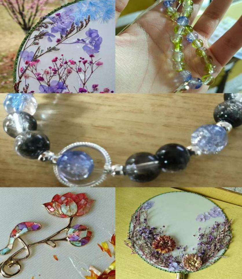 下午2时,在世纪楼A201教室开启了非遗文化体验之旅。参与者们将永生花精心布局于素白扇面,定格春日浪漫;手链编织台前,彩色玉珠随银线穿梭,串起个性时尚;螺钿发簪体验区尤为火热,参与者将贝母薄片镶嵌于木胚,感受千年非遗技艺的匠心传承。活动现场笑语不断,大家沉浸于指尖创作,一件件独具匠心的作品渐次诞生。亲手制作发簪不仅解压,更能让人体会到传统美学的精妙。