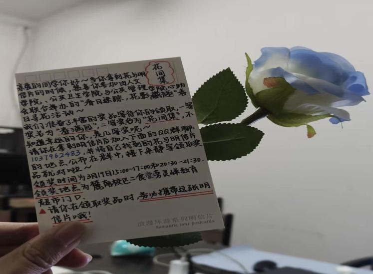 活动以谜语寻花为主线,指引同学们根据活动前期宣传说说中的谜语找到藏花地点。三院心助会成员提前在校园的林荫道、教学楼角落、湖畔草坪等区域藏好花朵与明信片。3月15日晚,寻花谜语通过活动QQ群发布,谜语紧紧贴合各处藏花地点的特色。16日,同学们纷纷根据线索开启寻花之旅。潇湘校区图书馆前的玉兰树旁、麓南校区文法楼转角的花坛边……同学们或独自细察,或结伴讨论,俯身寻觅石板缝隙中的明信片,仰头发现枝桠间悬挂的花朵,欢声笑语与春日暖阳交织成趣。截止至3月16日晚,四个校区的所有花朵与明信片均被找到。随后,成功找到花朵与明信片的同学可根据明信片上指定的时间和地点前往各校区兑换点领取奖品。活动设置一等奖“春满园”和二等奖“花间集”两类奖项,泡泡机、日历、花朵笔筒等丰富奖品一定能让参与者们满载而归。