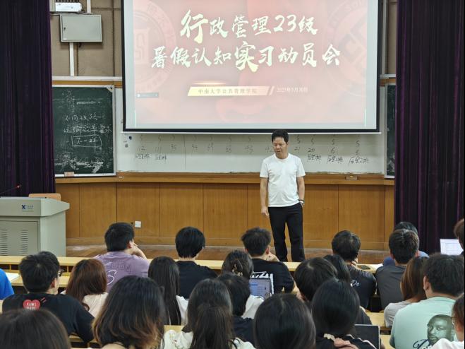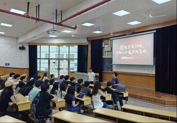 5月30日下午4时,公共管理学院行政管理专业23级本科生暑期认知实习动员大会于世纪楼C101教室召开。公管系系主任欧阳万福老师、副教授刘媛老师,23级本科生辅导员梁慧,行政管理23级全体本科生参加动员会。本次动员大会由欧阳万福老师主持。