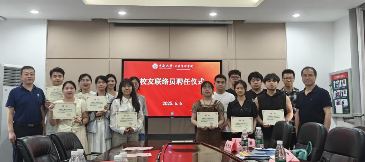 6月6日下午3时,公共管理学院在天心校区公管楼209会议室举行2025届毕业生代表座谈会暨校友联络员聘任仪式。学院党委书记杨旭东、院长许源源、副书记耿贵斌、副院长李晓飞,公管系主任欧阳万福、社会学系副主任米莉、本科毕业生辅导员梁慧、本科生教务办老师艾晓果、研究生教务办老师张伟芳与学院2025届毕业生代表出席参加此次会议。会议由学院党委副书记耿贵斌主持。