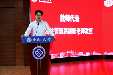 教师代表、公共管理系胡盼老师发言。他寄语新生要主动认识自己。首先要带有好奇心,勇于探索大学生活激发热爱;其次要勇于突破舒适区,认识自己的能力边界;最后要积极拥抱世界,在与他人的互动中认识自己的价值。