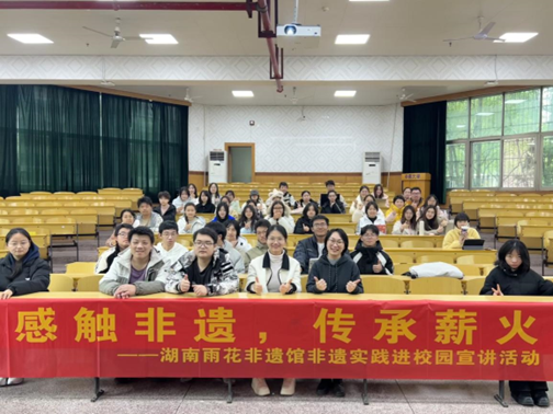 12月5日下午2时,由公共管理学院与湖南雨花非遗馆联合举办的“感触非遗,传承薪火”非遗实践进校园宣讲活动在天心校区世纪楼C101教室顺利举行。湖南雨花非遗馆彭智慧老师、本科生辅导员梁慧与40余名同学共同参与本次活动。