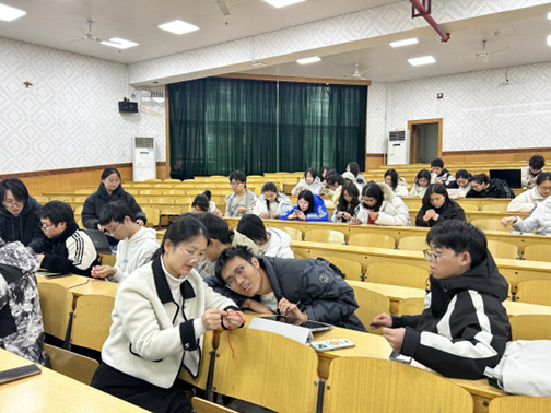 随后,活动进入实践环节。彭老师为每位同学分发红色丝线,悉心教授五彩绳编织技艺,并重点示范象征坚韧不摧的“金刚结”编法。她穿梭于座位之间,俯身指点,手把手传授绕线、穿引、收结的每一个细节。同学们在静心编织中,不仅体会到技艺的精妙,更感受到一份沉静、执着与敬畏的匠人精神。