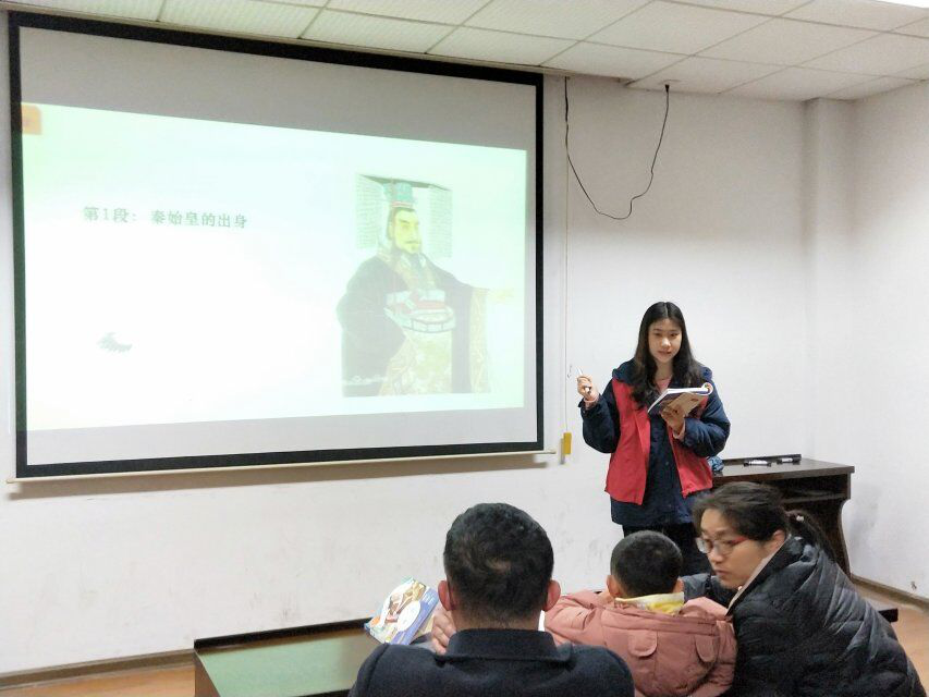 本次活动中,8位小朋友在家长的陪同下一起学习传统国学经典,由来自公管院的学生志愿者为其进行知识讲解与指导。此次大讲堂共分为三节课,第一节课的内容选自《史记故事》中的《秦始皇的故事》。志愿者用生动的语言讲述了秦始皇的生平事迹,带小朋友们深入了解这位传奇人物。