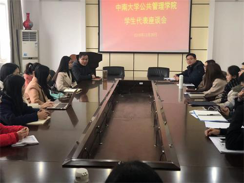 公共管理学院于2018年12月20日下午4点在升华后楼719举行了公管院学生代表座谈会,许源源书记、周谨平副院长、孙立明老师、梁慧老师、王梓懿老师、研究生及本科生学生代表参加了本次座谈会。