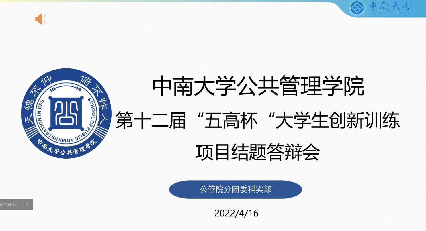 4月16日下午14时,由公共管理学院分团委科实部主办的第十二届“五高杯”大学生创新训练项目结题答辩活动于线上顺利进行。本次共有9支队伍参与答辩,科实部王中方同学主持会议,公共管理学院陈文琼老师和刘惠颖老师出席答辩会并担任评委。