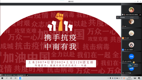 4月13日,三个班级共同开展线上抗疫宣讲活动,邀请健康中南宣讲团宣讲员刘鑫为同学们讲解抗疫相关知识。会前,土安与土木班两位团支书介绍了当下疫情的严峻形势,以此加强同学们对于防疫工作的重视程度,提高同学们在疫情期间的自我安全防范意识。线上会议开始,讲解员刘鑫为大家生动细致地讲解了当下国内防疫情况与我校采取的系列举措,帮助同学们更全面地了解个人防疫知识,不少人表示在这次宣讲活动中受益匪浅。接下来的知识问答环节中,主持人提出了一个又一个与抗疫相关的问题,同学们争先恐后有序参与抢答,线上会场活跃不已,气氛热烈非凡。