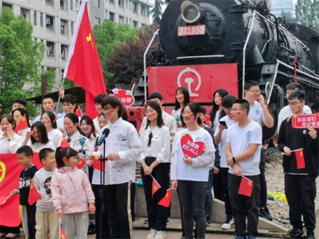 在组织部成员的安排下,同学们到达后迅速有序站队,每人手中握着一面鲜艳的小团旗,脸颊贴着一张鲜红的团旗标志,胸前佩戴一枚闪亮的团徽,与身后独特的红色火车头相互辉映。