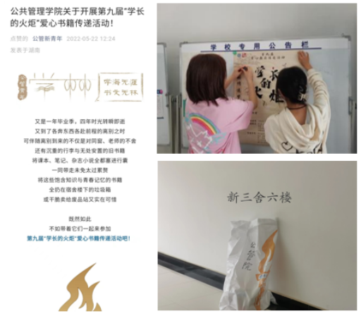 从5月16日至5月21日,学院采用线上+线下相结合的方式,加大活动宣传力度,让“学长的火炬”爱心书籍传递活动深入人心。线上方面,通过学院官方微信公众号制作活动推送,并通过QQ群、微信群等渠道积极转发活动推送,号召全院本科生、研究生参与书籍传递。线下方面,学工办助理深入我院学生所在各宿舍楼栋内,粘贴活动海报,走访各毕业生宿舍进行“扫楼征书”,重点面向大四、研三毕业生讲解活动意义、发放倡议书和精美书签来进行活动宣传,进一步增强了宣传效果。