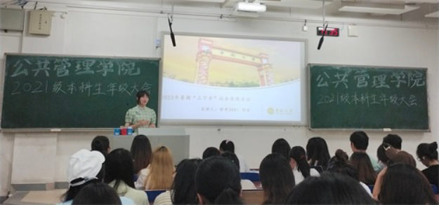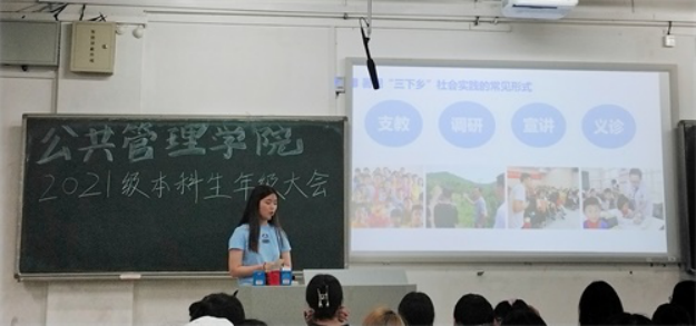 6月12日下午3时30分,在新校区A座101教室,学院召开2021级本科生年级大会。学院2021级本科生辅导员梁慧主持本次大会,学院优秀学生代表行管1901班穆梦慧,哲学2001班陆喆,社会学2002班董慧茹,学院2021级全体本科生(含分流至我院专业学生)参会。