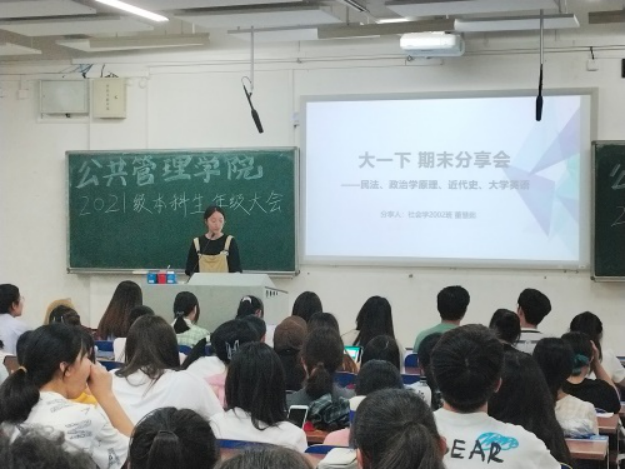 之后,学院优秀学生代表进行社会实践经验与备考经验分享。穆梦慧学姐与陆喆学姐分别以社会实践参与者和分团委科实部部长的不同视角,对暑期“三下乡”社会实践活动进行了详细解读,极大地填补了大一学生在社会实践方面知识的空白。董慧茹学姐则为备战期末考试学弟学妹们提供了英语、民法、政治学原理、近代史等四门课程的复习与答题小技巧,强调掌握基础知识的重要性。三位学姐的分享干货满满,21级学子们认真听讲记录,听后纷纷表示收获颇丰。