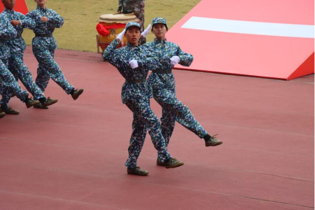 随着刺杀操方阵的退场,二十九连的分列式方阵紧随其后,在连旗的带领下,数统院学子迈着坚定的步伐,带着激昂的神情,昂首挺胸,齐步前进,一声声口号气势滔天,毫不逊色于真正的军队。分列式方阵走到主席台下时,全体成员由齐步走改为正步走,一步一步铿锵有力而又整齐划一,每位同学脸上都写满了庄严肃穆。最后,同学们由正步再次变为齐步走,伴随着军训的落幕退场。