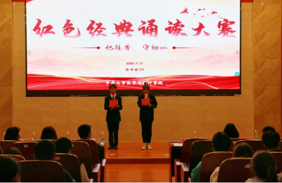 为深入学习贯彻党的二十大精神,坚持不懈用习近平新时代中国特色社会主义思想铸魂育人,激励青年学生坚守初心、不负韶华,数学与统计学院于11月13日14:30举办“忆往昔,守初心”红色经典诵读大赛。数统院辅导员老师王芬、王孟正、张泽超、仇远林、谢昕蕊,资安院团委委员马丽,法学院团委副书记李荣儒出席本次活动并担任评委,来自各年级的18支队伍参加比赛。