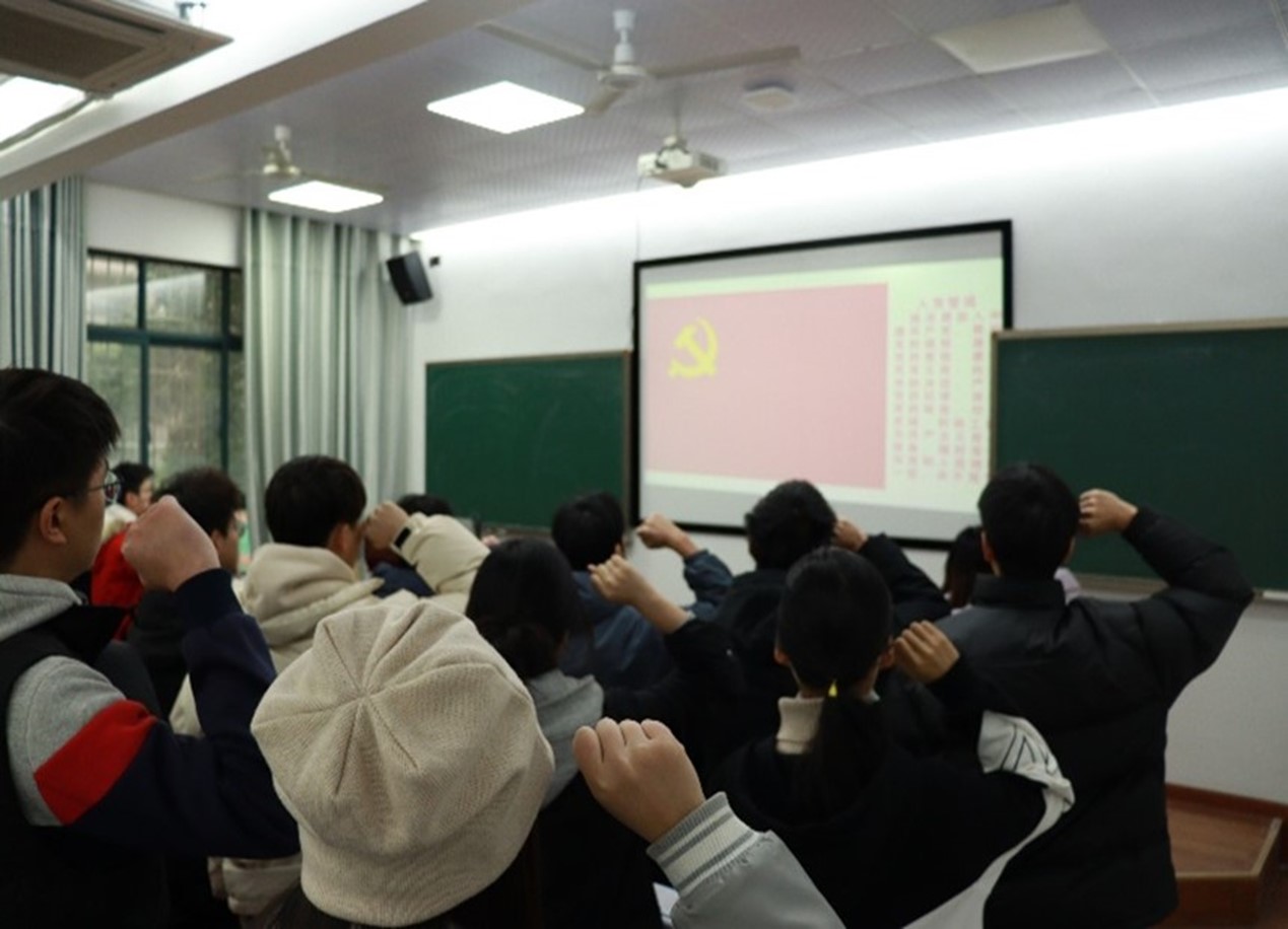 伴随着庄严的《国歌》和《国际歌》,分党校班导师仇远林带领全体预备党员右手举拳过肩,半侧面面向党旗,铿锵有力地宣读入党誓词,表达对党最庄严的承诺。