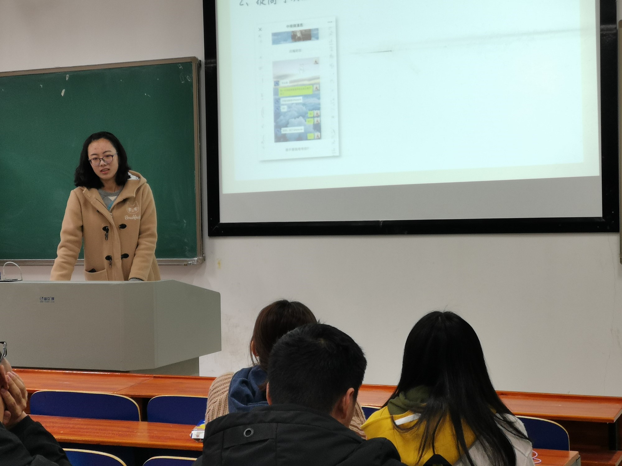 对于新媒体中涉及到的微信公众号运营,樊逸璇部长在排版心得方面进行了的分享。她首先点出了排版中最重要的四个方面,即展现逻辑思路、突出重点,提高可读性,有力引导读者和给读者带去良好的阅读体验,然后通过具体的例子来对各方面进行讲解。她还强调了文字、段落以及细节处理中需要注意的问题。樊部长不仅仅向大家介绍了排版方面的知识,还向大家分享了有趣的与新媒体工作有关的公众号,呼吁大家通过班级宣传工作真正爱上新媒体,不断在这个领域探索钻研。