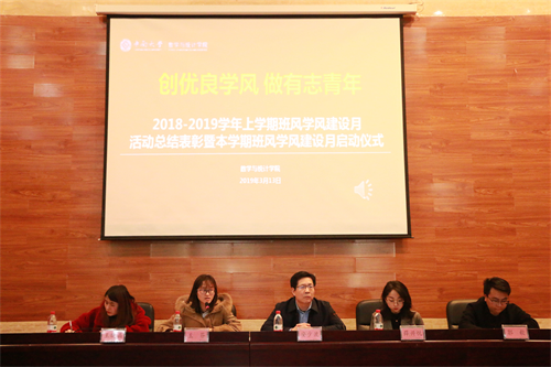 王晓晶老师宣读《关于启动数学与统计学院2019年上学期班风学风建设考核评比的通知》,明确了活动启动时间、主题以及对班级班风学风建设考核评比细则,并表示希望大家在新的学期以评促建、以评促改、评建结合、重在建设,涌现出更多优秀的班集体。