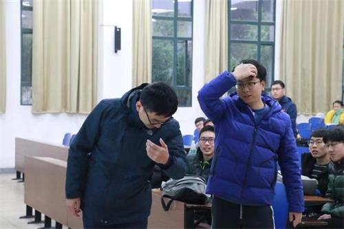 郭毅老师对班长们的讲述进行了总结和补充。他结合自身经历,告诉同学们期末备考的重要性和必要性,希望同学们迎难而上,积极向老师和其他同学寻求帮助,夯实基础,更进一步。他提及应数专业大一的零挂科率,以此激励同学们认真备考,争取再创佳绩。除此之外,他着重强调了同学们要遵守考场纪律,做到诚信应考。在校园安全问题上,郭老师叮嘱学生做到财不外露,切实有效保管好自身贵重财物,防范好各类形式金融诈骗;告诫同学们不要使用违章电器,不留安全隐患,确保冬季用火用电用气安全;他还亲自做示范,教导同学们遇到人身危险时自救的方法。