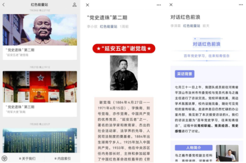 首先,我团队在线上开展了“党史遗珠”版块,将前期收集的流传度不高的红色事迹以推送的形式发布,以供阅读。前期制作完成的对话红色传人访谈资料也将以推送的形式在公众号上发布,对受众群体有一定的引导作用。
