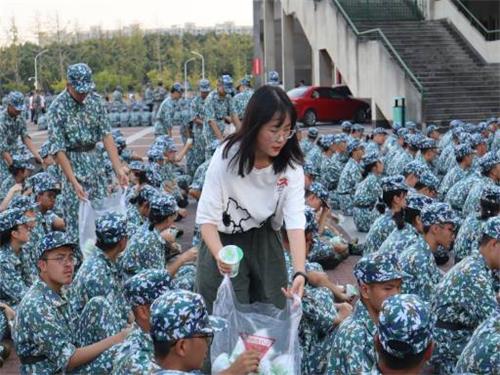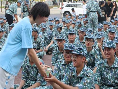 心助会的一行人刚刚到达时,新生正在进行着紧张的训练。在征得连长同意后,各排长迅速组织全体同学休息。同学们整齐划一地坐下来之后,心助会工作人员有序地给新生和教官分发绿豆冰沙,各排长组织新生鼓掌表示感谢,现场气氛十分融洽,俨然一个大家庭。