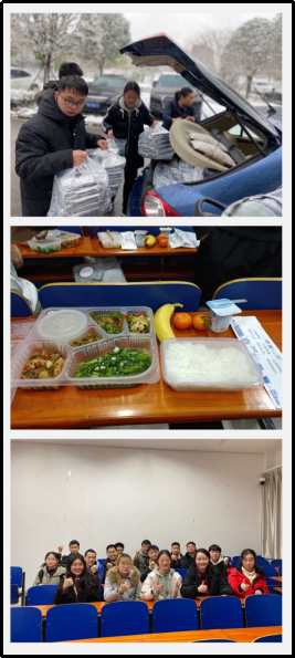 12月25日、26日考研当天,学院组织学生工作人员和老师一起为考研学生在数理楼开设了临时后勤保障室。一方面协调教室、打开空调、关上窗帘、黑板写上祝福等为考研同学中午提供良好的午休场所;另一方面为有需要的考研同学订了盒饭解决中午吃饭难的问题,同时还贴心准备了酸奶以及香蕉橘子等水果,确保考研学生吃饱吃好。26日当天雪花纷纷,天气异常寒冷,工作人员立即为考研同学团购了暖宝宝给大家带来了温暖。虽是寒风凛凛,学院师生的一个个暖心举动如同冬日里跃动的火苗,温暖着考研学子的心。考研同学们都表示自己感到十分幸福,有着老师和同学们的支持作为后盾,一定会带着大家的关心与祝福轻装上阵。