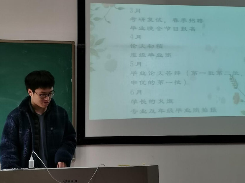 本次班会主要分为两个部分,第一部分由陈兆阳同学首先总结了上学期的班级工作情况。他提出这是同学们大学四年的最后一学期,他希望同学们能够遵守学校纪律,安排好本学期的各项事务,站好最后一班岗。随后陈兆阳同学向同学们汇报了本学期工作安排,本学期的同学们主要任务就是做好毕业设计,从2月到5月依次完成论文的开题、中期报告与最后的答辩。同时考研的同学要做好复试的准备,找工作的同学要把握好春招的机会,争取找到心仪的工作。