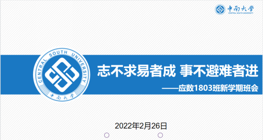 为了激发同学们在新学期的学习热情,帮助同学们明确毕业去向,给自己的大学生活画上一个圆满的句号。2月26日下午4时,应数1803班于新校A308教室举行新学期“志不求易者成。事不避难者进”主题班会,全体同学以及班导师郭毅老师参加,会议由班长韩京航同学主持。