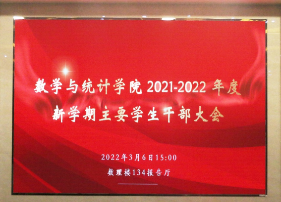 新学期、新起点、新征程。3月6日下午15时,为让学生干部更好了解新学期的工作目标与要求,数学与统计学院在数理楼134报告厅组织召开党、班、团主要学生干部大会。学院党委副书记安少波老师主讲,各年级辅导员老师以及学院主要学生干部参加会议。