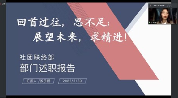 为回顾总结最近一年各部门工作成果,加强各部门间优势互补,促进各部门相互学习,提升团委、学生会工作人员综合能力,明确发展目标,达到更好地服务同学的目的,同时紧跟防疫相关要求,数学与统计学院团委、学生会工作述职评议大会于3月30日下午3点在线上腾讯会议准时召开。参加大会的有学院党委副书记安少波老师,学工办副主任、18级辅导员王芬老师,19级辅导员王孟正老师,院团委书记、20级辅导员张泽超老师,21级辅导员仇远林老师,研究生辅导员暴田田老师,以及学院团委、学生会全体成员。