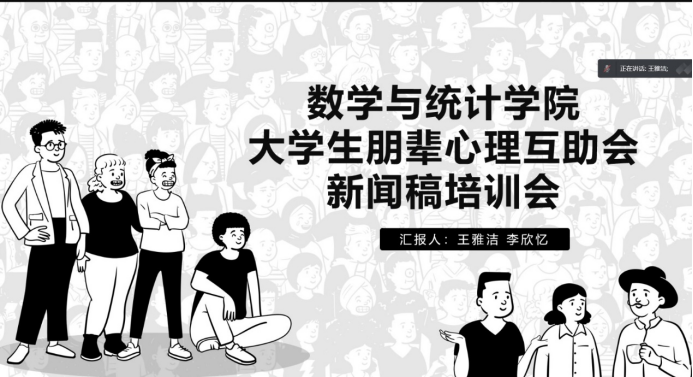 为了提高数统院心助会办公室干事撰写新闻稿能力,提高后续新闻稿稿件质量,从而更加高效、精炼地记录心助会发生的各类事件,数统院心助会于4月26日20:00召开新闻稿撰写线上培训会。本次培训会由办公室主任王垠植主持,数统院心助会前任会长王雅洁与前任办公室主任李欣忆主讲,办公室干事积极参与。