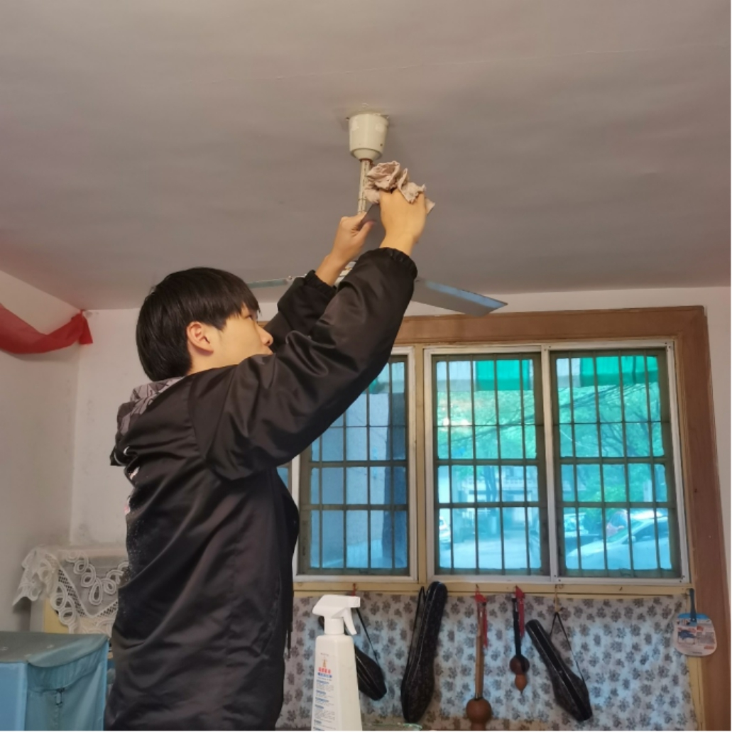 由于两位老师刚刚出院,身体情况还未完全恢复。于是志愿者同学们帮助老师进行了房屋高处的一些清理,如风扇、橱柜、门框等。通过本次志愿服务,强化了同学们的社会责任感、公共服务意识与主动作为的奉献精神。