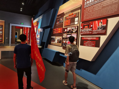 最后,实践团来到历史陈列馆,这里分为五个模块:建党先声、浴血奋斗、接管建政、改革开放、逐梦前行——分别从不同的角度回顾党的各个历史进程。陈列馆中丰富多样的藏品,如油画、历史文物、海报、塑像、视频等等,配上馆内独特的灯光,让实践团的队员们仿佛正在亲历那段历史,感同身受地体会党的艰辛与伟大,也激发出了心中最强烈的爱国热情。