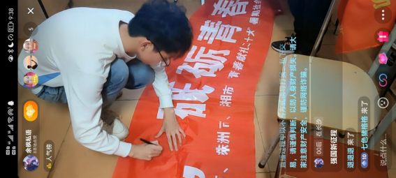 接着,实践团成员通过在宿舍布置电影幕布的方式为大家放映《觉醒年代》,让网友们感受旧时代新青年们思想的碰撞。最后一个环节,实践团直播工作人员在横幅上签下自己的姓名并写下数句对党、对国家、对自己的寄语,呼吁与广大网友一同:感党恩,颂党情,为中华之复兴砥砺前行。