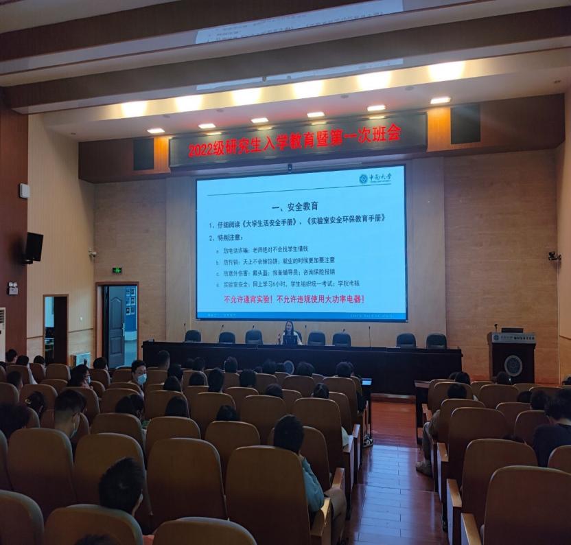 会上,胡菁菁老师对新任职各班班委委员进行介绍,要求同学们积极配合班委开展班级各项建设,以形成优良的班风学风,形成你追我赶的良好科研氛围。接着,胡老师就安全、诚信等主题开展新生入学教育,她特别强调了学生人身安全和防止电信诈骗安全,以及骑电动车务必戴好安全头盔等注意事项。胡老师对学生普遍关心的入党流程、社会实践和学术讲座考勤等进行了详细说明。最后,她希望2022级全体研究生要遵守规矩、尊重师友、孝顺父母、谈好恋爱,在研究生阶段都能够收获满满。在未来的学习工作中,2022级研究生新生将锐意进取,展现研究生良好的精神面貌,为学院的建设发展贡献青春力量!