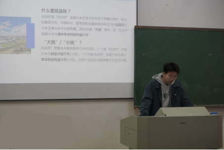尹畅首先介绍了挑战杯科技学术竞赛,接着引出我校特色举办的升华杯赛事,并介绍了竞赛规则及参赛流程,同时就相关材料的提交安排及项目申报书给出相关建议。