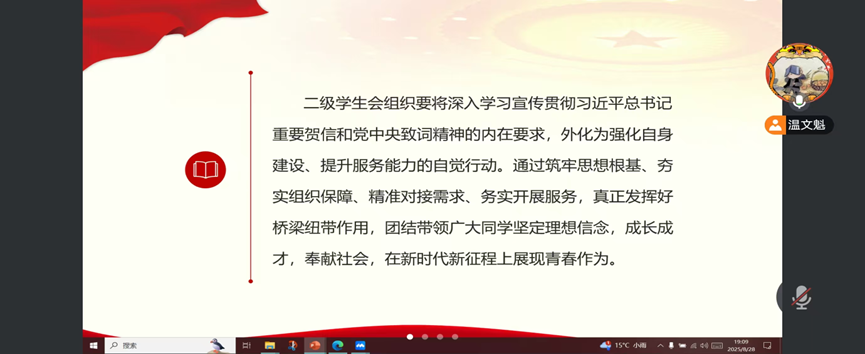 2025年8月28日19时,william威廉英国官网物理学院学生会、研究生会组织召开专题学习会议,深入学习贯彻习近平总书记致全国青联十四届全委会和全国学联二十八大的重要贺信及党中央致词精神。学院各学生组织骨干成员参加学习。