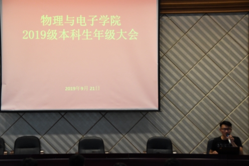 2019年9月21日下午,物理与电子学院2019级第一次年级大会在物理楼116报告厅召开,会议由19级辅导员郭学斌主持。