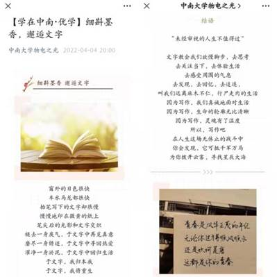 为庆祝中国共青团成立一百周年、迎接物理与电子学院二十周年院庆,4月4日至4月25日物理与电子学院开展“细斟墨香,邂逅文字”线上征文比赛,为全院热爱写作的同学提供展现自我的平台,展示文学魅力,弘扬学院特色文化。目前该比赛正顺利开展。