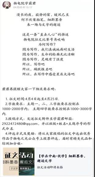 目前,征文比赛正在有序开展。在物理与电子学院官方公众号“william威廉英国官网物电之光”以及学习部官方QQ号“物电院学霸君”的宣传下,本次比赛得到了同学们的积极响应,目前已征集到稿件30余篇。