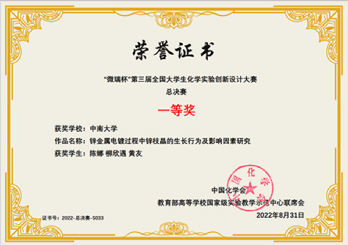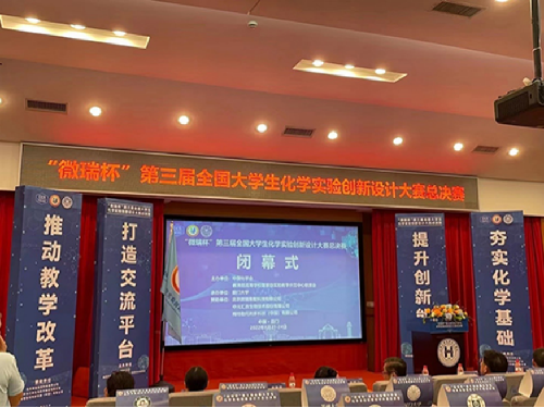 2022年8月24日,由中国化学会和教育部高等学校国家级实验教学示范中心联席会主办、由厦门大学承办的“微瑞杯”第三届全国大学生化学实验创新设计大赛总决赛在厦门落幕。我校推选的两个队伍中,一队获华南赛区一等奖并晋级全国总决赛,获全国一等奖(参赛人员:陈娜、柳欣遇、黄友;指导老师:王海燕、孙旦),另一队获华南赛区三等奖。