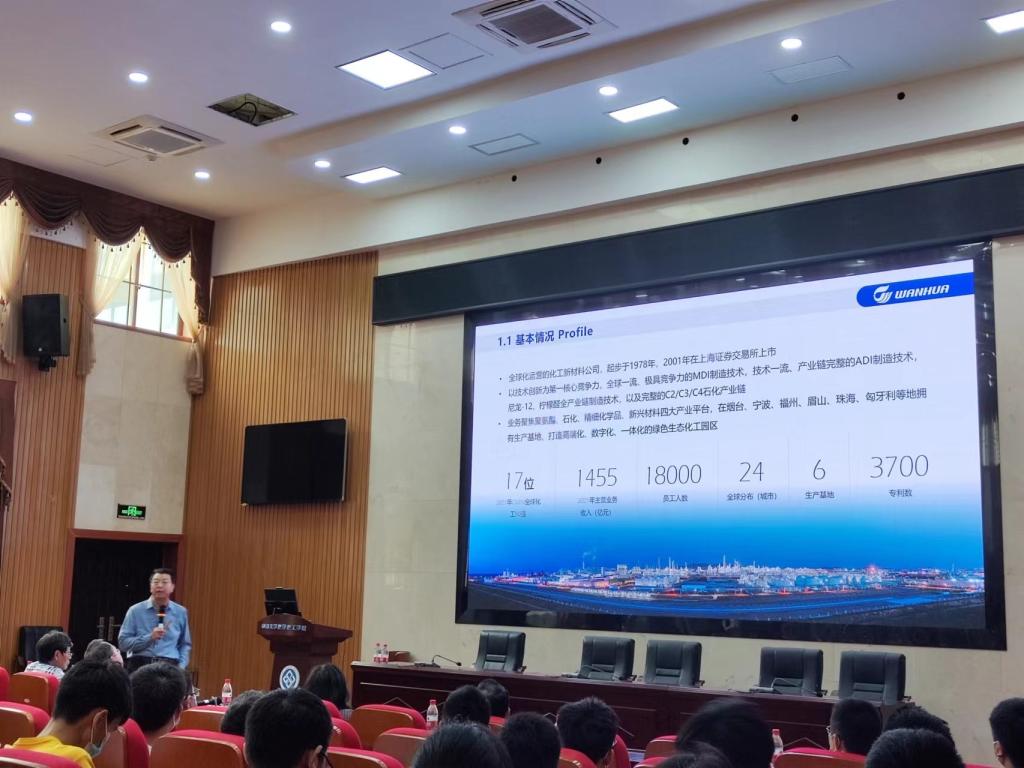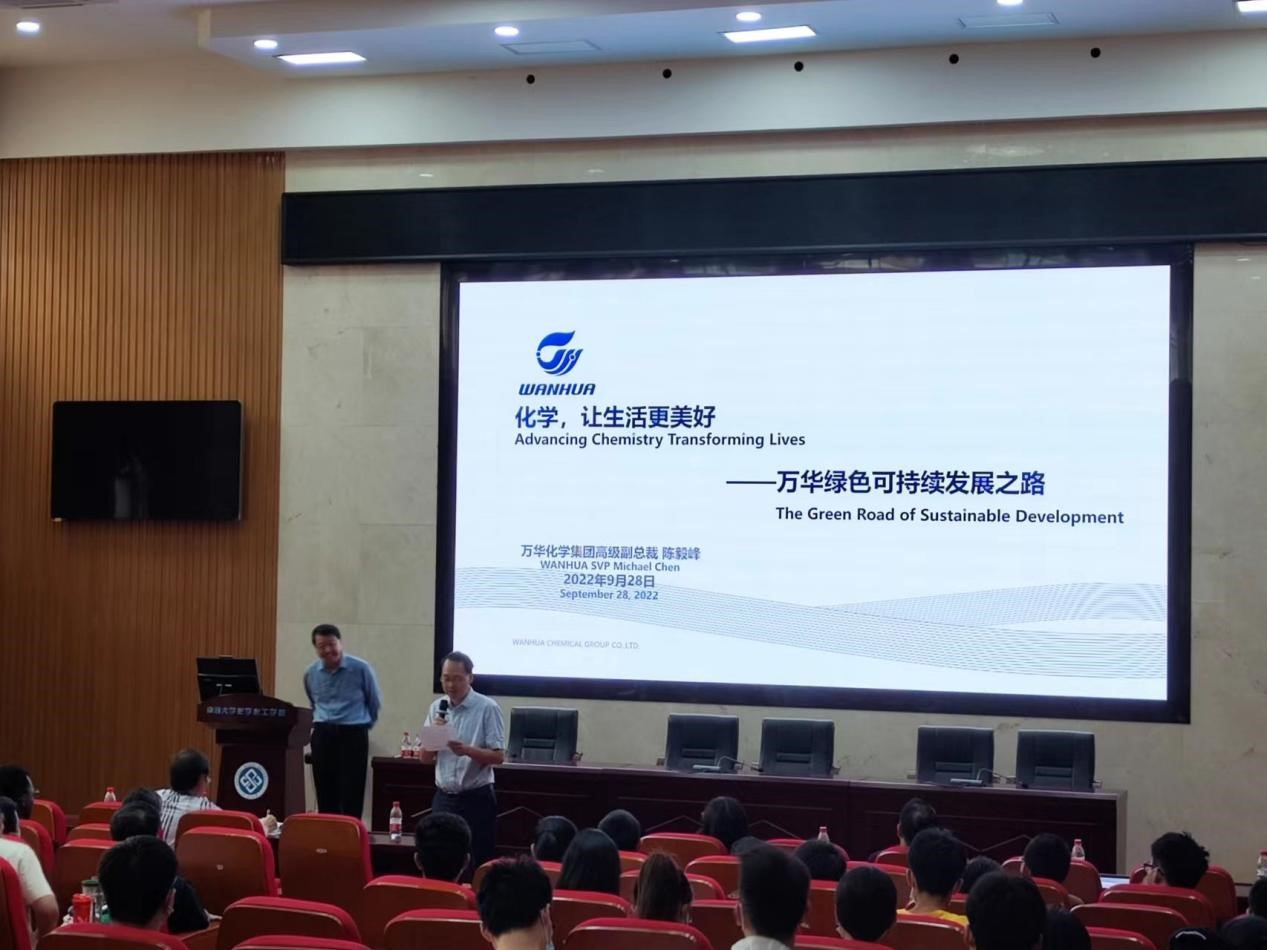 报告开始,陈毅峰副总裁提到习总书记对万华化学产品研发、制度创新、科技创新、国企改革以及环保和科技发展方面的肯定。陈毅峰副总裁向同学们介绍、展示了万华化学集团股份有限公司在科技创新、美丽化工与万华绿色和可持续发展方面的成绩。万华化学主要从事异氰酸酯、多元醇等聚万华化学氨酯全系列产品、丙烯酸及酯等石化产品、水性涂料等功能性材料、特种化学品的研发、生产和销售,是全球最具竞争力的MDI制造商之一,欧洲最大的TDI供应商。万华化学是中国唯一一家拥有MDI和ADI制造技术自主知识产权的企业,产品质量和单位消耗均达到国际先进水平。