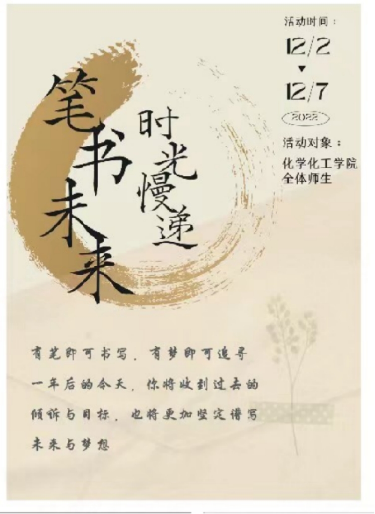 在本次活动中,心助会向同学们发放信封,同学们写下给一年后的自己的一封信后再由心助会回收并妥善保存,待一年后再归还给同学们。同学们在信中可寄托对未来的美好期许,也可笔谈往日的青春奋斗诗篇,更可尽情吐露自己的心声密语。信封预计将在12月7日晚于二食堂一楼回收,保存于化学化工学院231化语屋。