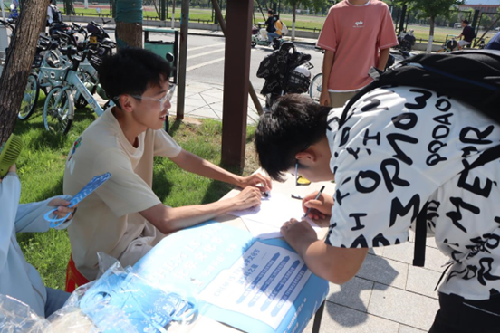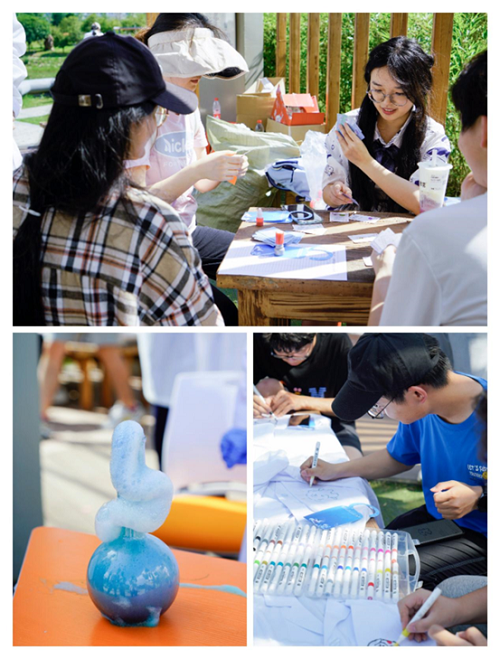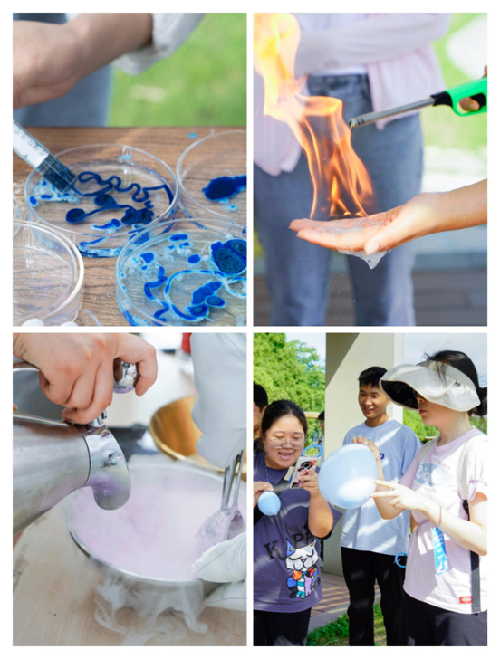 第二站来到“水下蓝缎”“氦人听闻”,同学们在玻璃皿中留下蓝色印记,吸入氦气后秒变小黄人,引得围观同学哈哈大笑,第三站“有求必应屋”,幸运的同学看到了美丽荧光,第四站“掌上火焰”,在实验员的讲解与指导下,同学们学会了火焰咒,在自己手掌中释放出熊熊火焰,来到最后一站,此前收集的印章发挥了作用,同学们既可以换一杯液氮冰激凌解暑,又可以换取套圈机会,赢得自己心仪的奖品。