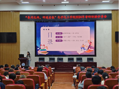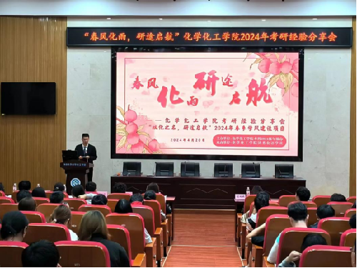 为帮助有意向考研的同学更加高效地备考,化学化工学院于4月20日在化工楼133报告厅举办“春风化雨,研途启航”考研经验分享会,本次活动属于“以化之名,研途起航”2024年春季学风建设项目内容。化学化工学院本科2021级辅导员胡雨琪参会,化工2003班王昱璇、化工2001班李诗霖、化工2002班陈绍聪、应化2005班刘恋、应化2001班郭自强、制药2001班单玉薇作为优秀学长学姐代表进行经验分享。逾百名本科2021级同学参加此次分享会。